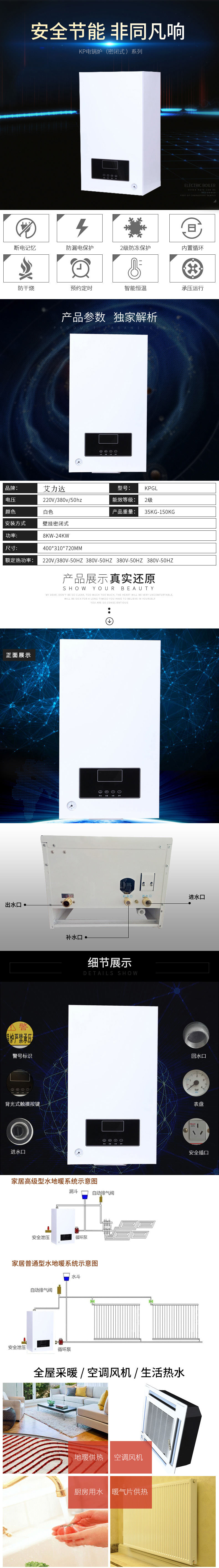 艾力達壁掛密閉式電采暖爐采用工業級微控器和高性的元器件,,壽命長。手機wifi智能控制,舒適,貼心。獨立的控制板與操作板,便于安裝和維護。4種預置模式,操作簡單。的故障實時監測和故障處理。可鍋爐使用。
